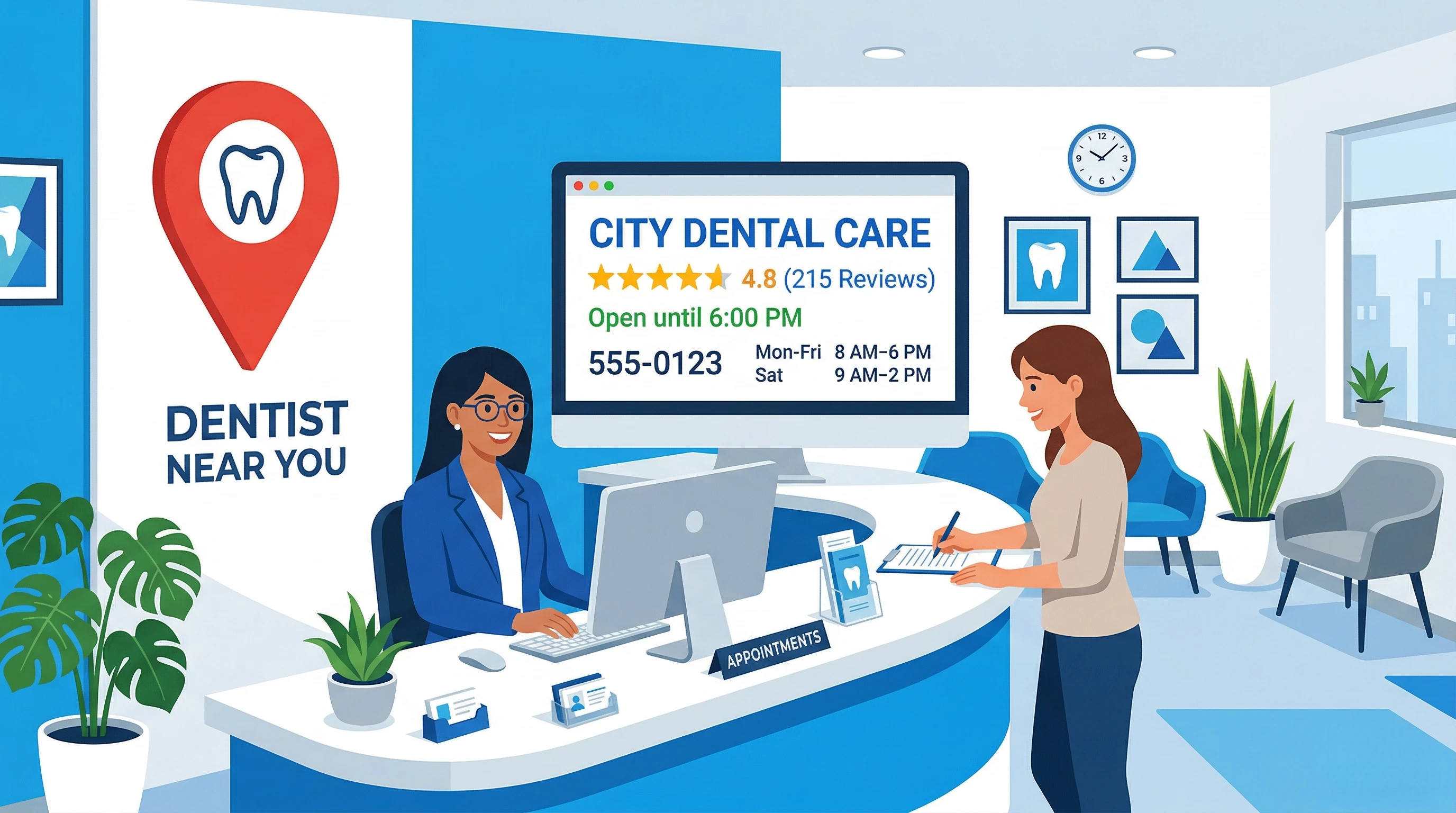 Categories: Set your primary category to "Dentist," then add every relevant secondary category: Cosmetic Dentist, Pediatric Dentist, Emergency Dental Service, Teeth Whitening Service, Dental Implants Periodontist, Orthodontist, and any other specialty you offer. Each category opens up new search queries where your practice can appear.